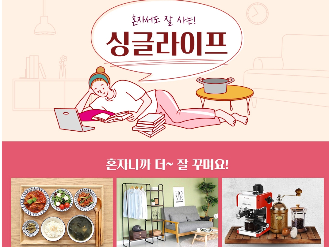 7. 싱글라이프 테마관이 있는데 혼자서도 잘 사는 라이프스타일을 위한 다양한 상품들이 소개되어 있습니다. 홈바, 소파베드, 미니그릴, 방범/호신용품 등의 상품들이 표시되어 있습니다.