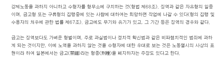 4. 법률용어사전에서는 금고형을 강제노동을 과하지 않고 수형자를 형무소에 구치하는 형벌로 설명하고 있습니다. 금고형은 징역형과 같은 자유를 제한하는 형벌의 일종이며, 형의 집행 및 수용자의 처우에 관한 법률 제67조에 따르면 금고형 또는 구류형의 집행 중인 수형자는 희망에 따라 작업에 참여할 수 있습니다. 금고형은 징역보다 가벼운 형벌로 간주되며, 주로 과실범이나 정치적 확신범 같은 비파렴치적 범죄에 적용됩니다. 일본에서는 금고형을 노동을 멸시하는 형벌로 보기도 하여 폐지하자는 주장도 있다고 합니다.
