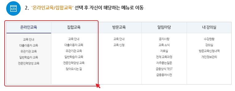 5. 로그인 후, 온라인 교육과 집합 교육 중 자신이 듣고자 하는 메뉴를 선택합니다. 각 교육 형태에 따라 제공되는 과정이 다르므로 본인에게 맞는 방식을 선택합니다.