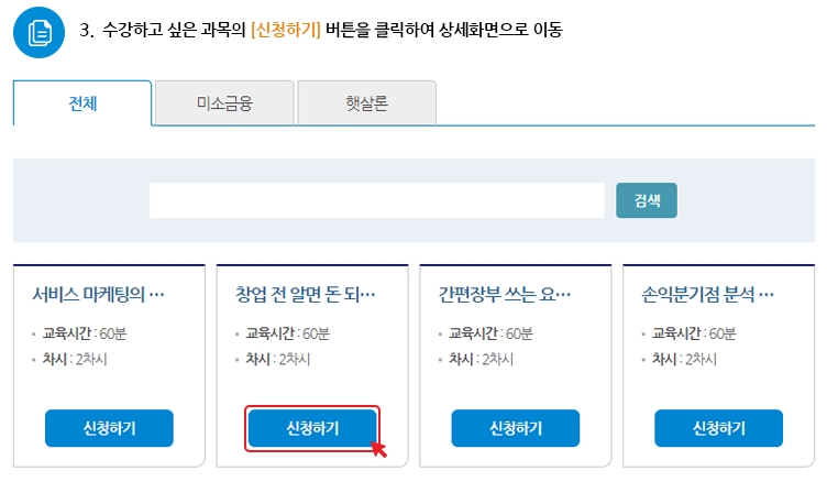 6. 원하는 교육 과정을 찾았다면, 해당 과목의 '신청하기' 버튼을 클릭합니다. 이 버튼을 통해 해당 과목의 수강 신청 페이지로 이동합니다.