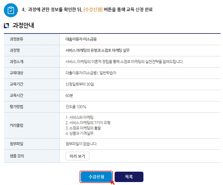 7. 수업에 대한 정보를 확인한 뒤, '수강신청' 버튼을 클릭하여 교육 신청을 완료합니다. 이 버튼을 클릭하면 신청 절차가 완료되고, 교육을 시작할 수 있습니다.