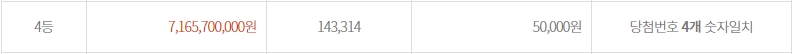 5. 당첨번호 4개가 일치하면 4등이고, 당첨금은 5만원입니다. 5등과 4등은 고정금액이라 확실해요.