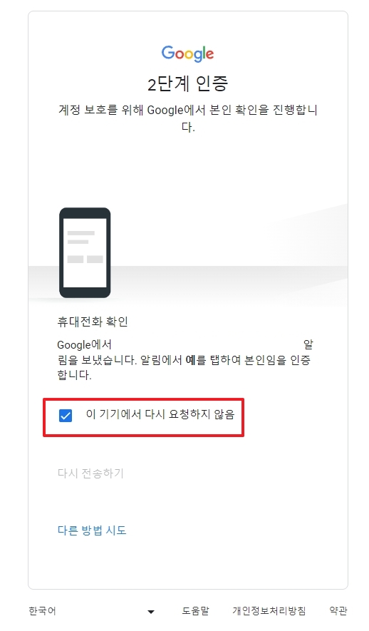 5. 만약 2단계 인증을 설정해놨다면, '이 기기에서 다시 요청하지 않음'이라는 체크박스가 나올 거예요. 이걸 체크하면, 다음부터는 이 기기에서는 2단계 인증 없이 로그인할 수 있어요. 하지만 이걸 해제하면 브라우저를 종료할 때마다 로그인이 풀리게 됩니다. 즉, 자동 로그인이 해제되는 거죠.