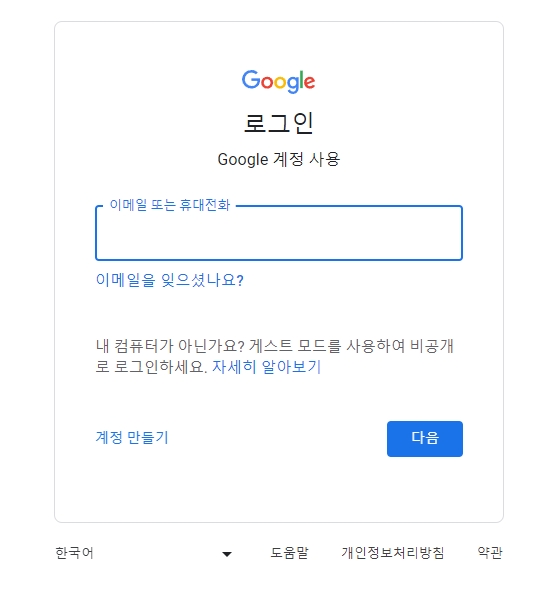 3. 로그인 화면이 나오면 아이디를 입력해요. 아이디는 이메일 주소나 휴대전화 번호로 입력하면 됩니다. 아이디를 입력하고 '다음' 버튼을 눌러요.