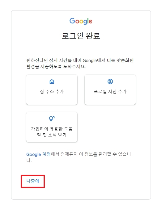 6. 로그인이 완료되면 구글이 맞춤형 환경을 제공하기 위해 추가 정보를 요청할 수도 있어요. 뭐, 저는 귀찮아서 그냥 '나중에' 버튼을 클릭했어요. 필요 없으면 굳이 입력 안 해도 됩니다.