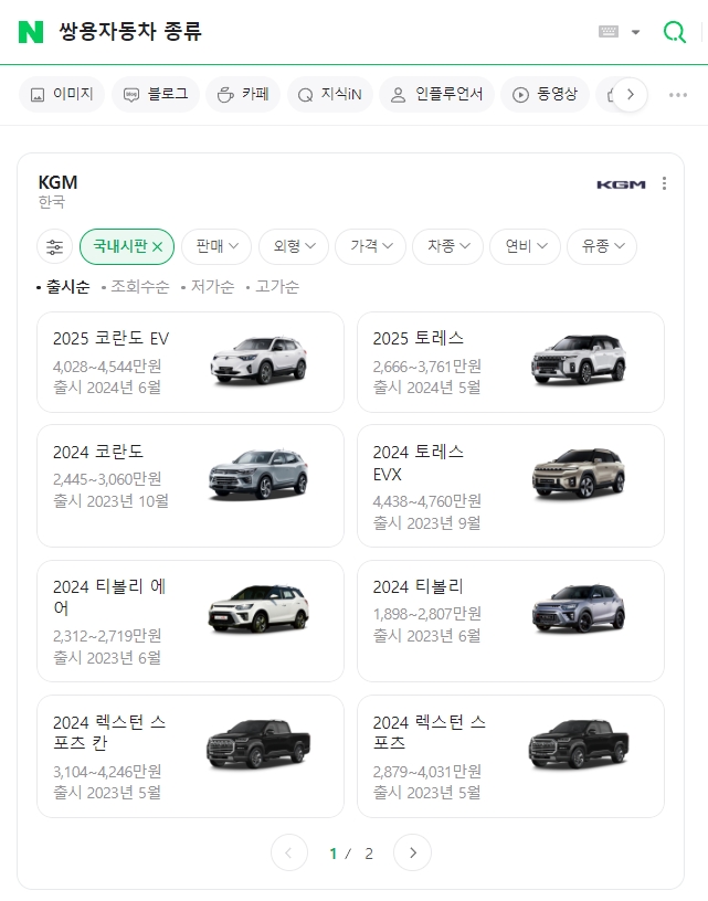 2. 네이버 검색창에 쌍용 자동차 종류를 입력하고 검색하면 현재 국내 시판 중인 쌍용 자동차들이 나와요. 다양한 모델들이 한눈에 보이니까 정말 편리해요. 여기서 내가 원하는 모델을 찾을 수 있어요.
