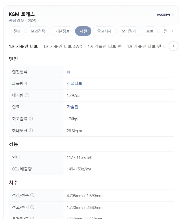 5. 차를 클릭하면 상세 정보로 넘어가게 되는데, 차를 검색창에서 검색한 것과 동일한 정보가 나와요. 모델에 대한 기본 정보는 물론, 세부적인 사양까지 한눈에 볼 수 있어요. 가격, 연료 타입, 연비, 출력, 엔진 등 다양한 정보가 상세하게 나와 있어요.