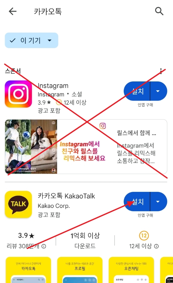3. 카카오톡을 검색했지만 광고 어플이 더 위에 뜹니다. 카카오톡 어플인지 잘 확인하고 설치 버튼 클릭하여 다운로드 후 설치해요. 과정은 자동이고 시간이 좀 걸릴 수 있어요.