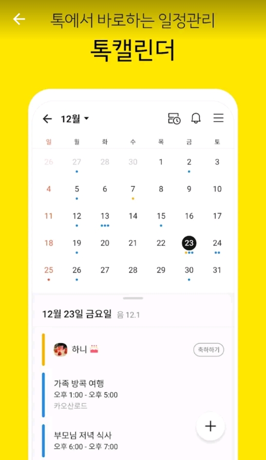 8. 톡에서 바로 하는 일정관리라는 문구와 함께 톡캘린더가 소개됩니다. 일정 관리를 쉽게 할 수 있어요. 생일, 약속, 중요한 일정을 카카오톡에서 바로 관리할 수 있어 편리합니다. 생일 알림을 놓치지 않게 도와주죠.
