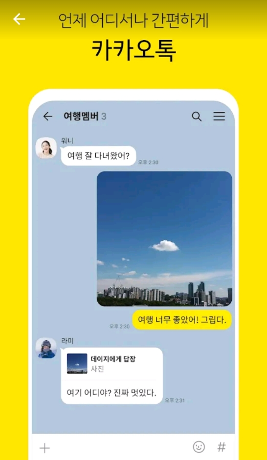 4. 카카오톡 설치가 완료되면, 첫 화면에서 언제 어디서나 간편하게 라는 문구와 함께 카톡창이 나타납니다. 여행 다녀온 사진을 공유하고 친구들과 대화하는 모습이 보여서 사용하기 전부터 기대가 됩니다. 실제로 여행 사진을 공유할 때 친구들이 반응해 주는 게 너무 재밌어요.