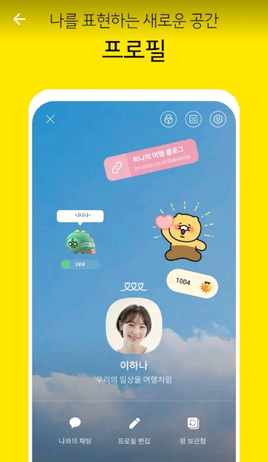 5. 다음으로 나를 표현하는 새로운 공간이라는 문구가 뜨고, 프로필 설정 화면이 나옵니다. 여기서는 프로필 사진을 설정하고, 상태 메시지를 입력할 수 있어요. 나만의 개성을 표현할 수 있어서 좋습니다. 프로필 꾸미는 재미가 쏠쏠합니다.