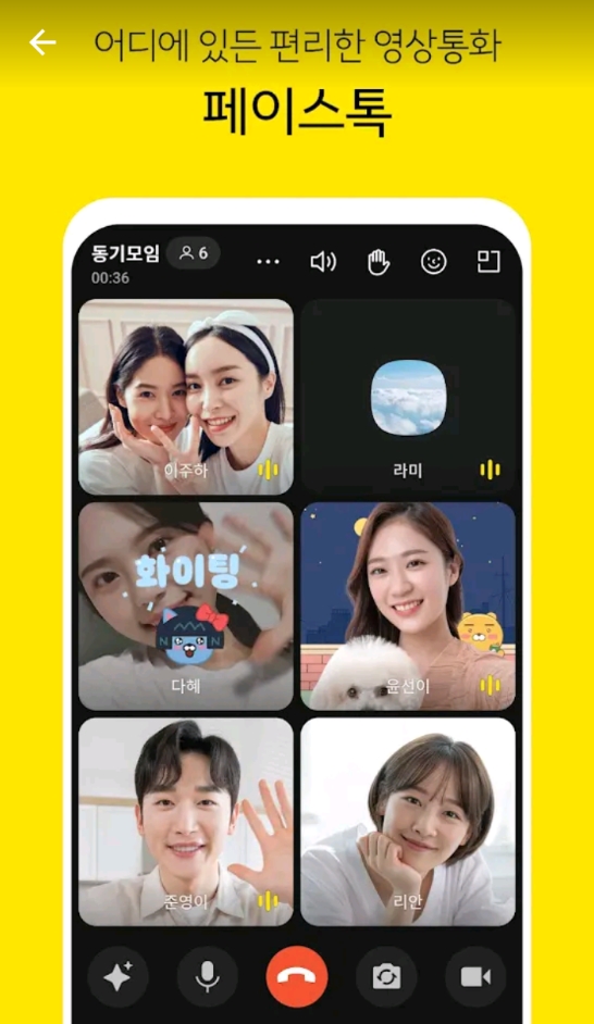7. 어디에 있든 편리한 영상통화라는 문구와 함께 페이스톡 화면이 나옵니다. 영상통화 기능이 있어 친구들이나 가족들과 얼굴 보며 대화할 수 있어요. 멀리 떨어져 있어도 가까이 있는 느낌을 받을 수 있습니다. 영상통화 하면서 친구들과 웃고 떠드는 재미가 있죠.