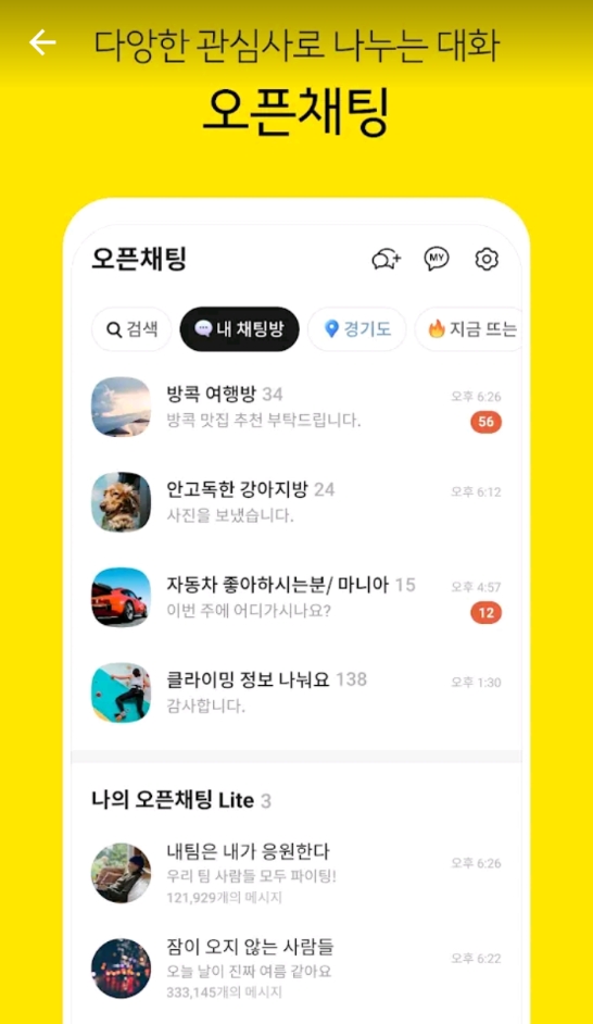 6. 다양한 관심사로 나누는 대화라는 문구와 함께 오픈채팅 방들이 보여요. 다양한 주제의 오픈채팅에 참여할 수 있어 새로운 사람들과도 쉽게 소통할 수 있습니다. 방콕 여행방이나 강아지방 같은 테마 채팅방이 많아서 흥미로운 주제에 대해 이야기 나누기 좋아요.