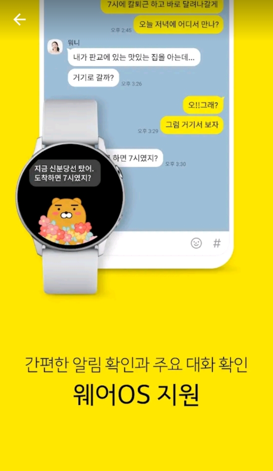9. 마지막으로 간편한 알림 확인과 주요 대화 확인이라는 문구와 함께 웨어OS 지원 기능이 나옵니다. 스마트워치를 사용하는 사람들을 위해 알림 확인이 쉽고 빠르게 됩니다. 운동 중이나 이동 중에도 중요한 메시지를 놓치지 않아서 좋아요.