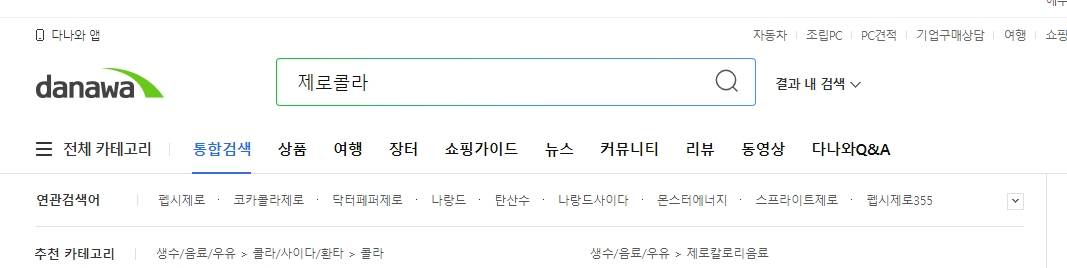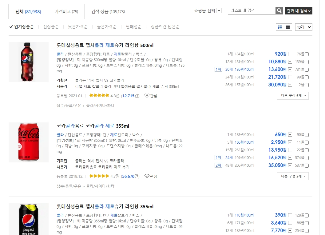 3. 예를 들어, 제로콜라를 구매한다고 가정하고 검색을 진행해 봅니다. 검색 결과에는 다양한 용량과 패키지의 제로콜라 제품이 나타납니다.