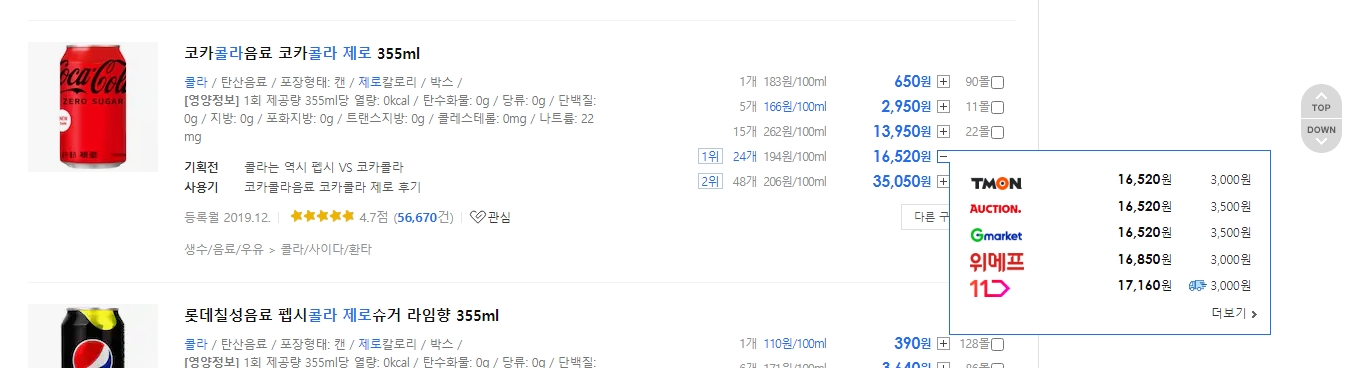 예를 들어, 코카콜라 제로 355ml를 24개 구매하려고 한다면, 다나와는 가격 비교를 통해 24개 패키지가 1위로 추천된다는 것을 보여줍니다. 100ml당 가격이 194원으로 표시되지만, 더 작은 패키지에서는 166원까지 낮아질 수 있다는 것도 확인할 수 있습니다. 다만, 택배비를 고려하면 24개 패키지가 더 경제적인 선택이 될 수 있습니다.
