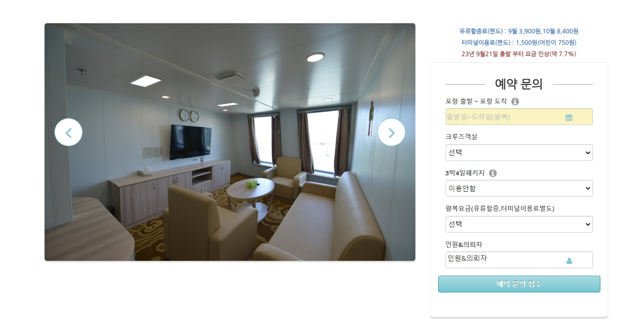 2. 울릉도 크루즈 홈페이지를 방문하면 메인화면에서 출발일자와 객실을 선택해 가격 정보를 확인할 수 있습니다. 예를 들어, 6인실의 경우 15만원, 4인실의 경우 20만원으로 표시되어 있습니다. 여러 사람이 함께 여행할 때 이러한 객실 선택은 비용 절약에 도움이 됩니다.