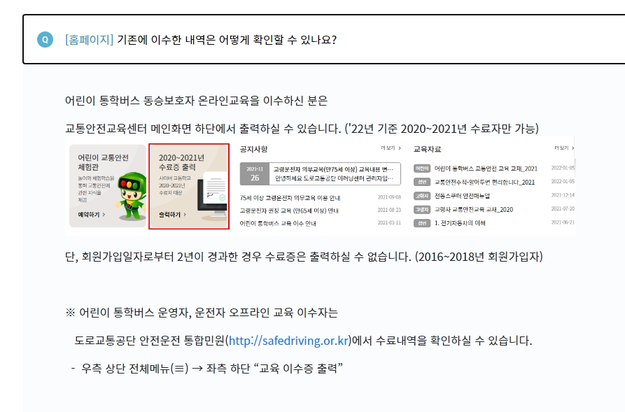 7. 또한, 기존에 이수한 교육 내역을 확인하고 수료증을 출력하는 방법도 많은 사람들이 궁금해하는데요. 이를 위해 별도의 메뉴가 마련되어 있어 쉽게 수료증을 출력할 수 있게 되어 있습니다.