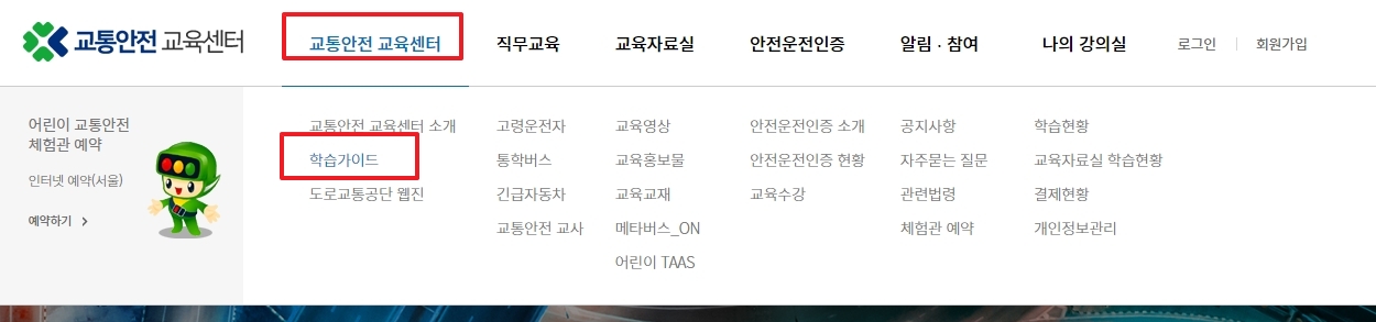 3. 상단 메뉴에서 '교통안전 교육센터 - 학습가이드'를 클릭해보세요. 이 메뉴에서는 교육 과정을 수강하는 방법을 상세히 안내하고 있습니다.