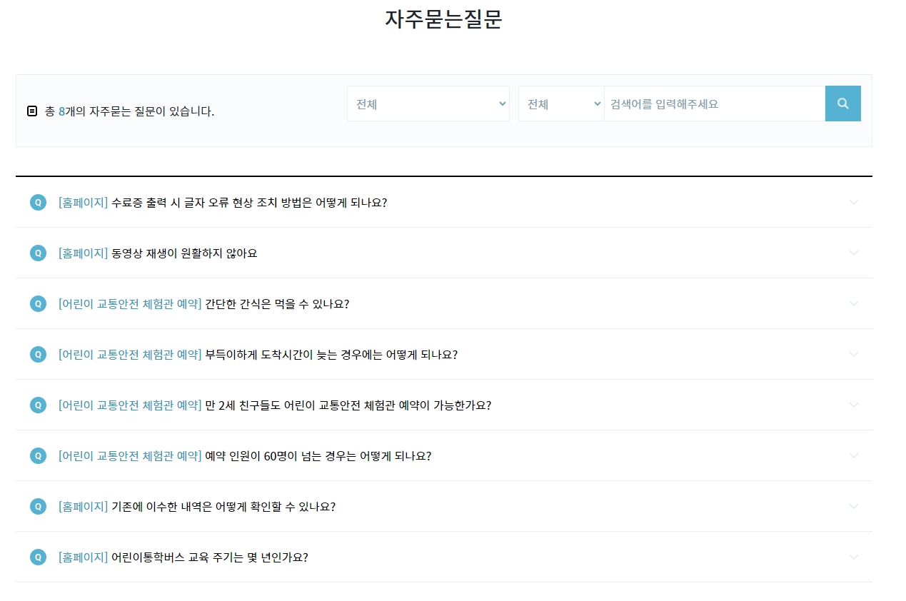 5. 자주 묻는 질문(FAQ) 메뉴에는 총 8가지 질문이 준비되어 있습니다. 이 메뉴를 통해 자주 발생하는 문제에 대한 해결책을 빠르게 찾을 수 있습니다.