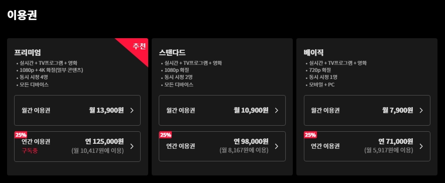 7. 다만, 티빙에서 실시간 TV를 이용하려면 이용권이 필요합니다. 예를 들어, 4명이서 이용권을 공유하는 경우, 연간 12.5만원을 48개월로 나누면 한 달에 약 2600원 정도로 서비스를 이용할 수 있습니다.