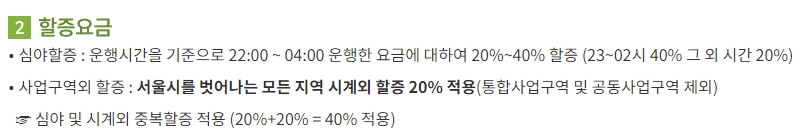 4. 할증 요금의 경우, 밤 10시부터 새벽 4시까지 20%에서 40%의 할증이 적용됩니다. 특히, 밤 11시부터 새벽 2시까지는 40% 할증이 적용되며, 그 외 시간대에는 20% 할증이 적용됩니다. 또한, 서울시를 벗어나면 시외 할증이 붙는데, 이 경우 기본적으로 20%의 할증이 추가됩니다.
