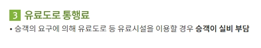 5. 유료도로 통행료는 승객의 요청에 따라 유료 도로를 이용하는 경우, 해당 통행료는 승객이 부담해야 한다고 명시되어 있습니다.