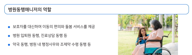 4. 병원동행매니저의 주요 역할은 보호자를 대신해 환자의 이동을 돕고, 병원 입퇴원 동행, 진료 상담 동행 등 다양한 돌봄 서비스를 제공하는 것입니다. 이를 통해 환자와 가족이 병원 생활에서 더 편안하고 안전하게 이동하며 필요한 서비스를 받을 수 있도록 지원합니다.