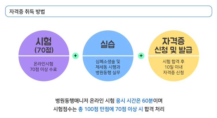 6. 자격증 취득 과정은 온라인 시험, 실습, 자격증 발급의 순서로 진행됩니다. 온라인 시험에서 70점 이상을 획득해야 하며, 시험을 통과한 후 실습을 통해 실무 능력을 키웁니다. 최종적으로 자격증이 발급되며, 이를 통해 병원동행매니저로서의 활동이 가능해집니다. 온라인 시험은 이론적인 지식만을 테스트하는 것일 수 있지만, 실습 과정을 통해 실무 능력을 보완할 수 있습니다.