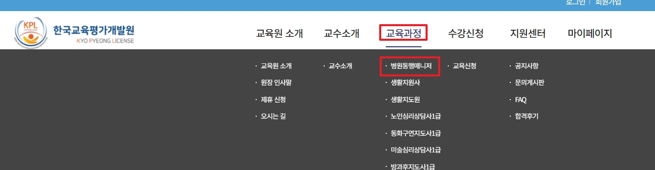 2. 상단 메뉴에서 교육과정 - 병원동행매니저 메뉴를 클릭합니다. 이 메뉴에서는 자격증 취득을 위한 교육 내용과 절차를 자세히 확인할 수 있습니다.