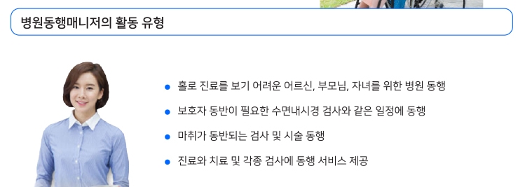 3. 병원동행매니저는 보호자나 가족을 대신해 도움이 필요한 환자의 안전한 이동, 안전관리, 진료 상담, 원내 행정사무, 조제약 수령 동행, 안전귀가 후 보호자에게 안내 및 진료 내용 전달 등의 서비스를 제공하는 전문 인력입니다.