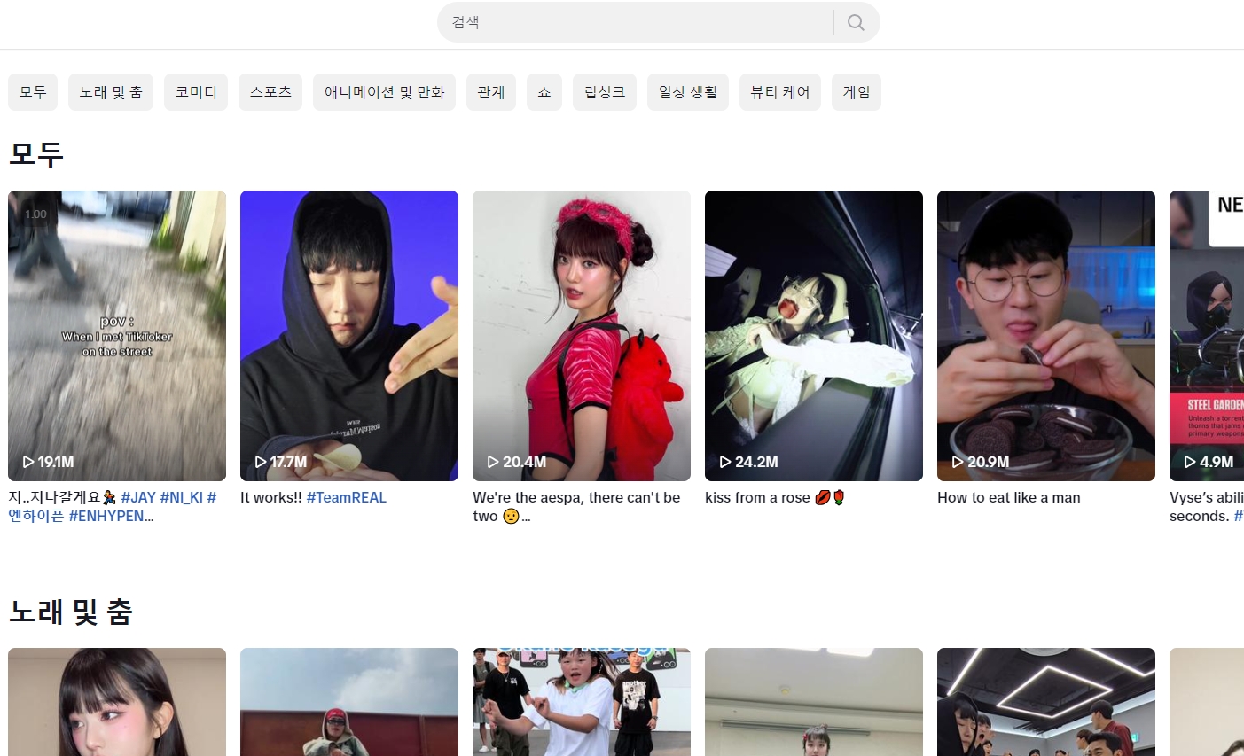 4. 탐색 페이지에서는 다양한 주제별 콘텐츠를 확인할 수 있습니다. 모든 주제를 비롯해 노래 및 춤, 코미디, 스포츠, 애니메이션 및 만화, 관계, 쇼, 립싱크, 일상 생활, 뷰티 케어, 게임 등의 카테고리로 나누어진 콘텐츠들이 제공됩니다. 사용자는 관심 있는 카테고리를 선택하여 그에 맞는 동영상을 쉽게 찾을 수 있으며, 전 세계의 인기 있는 트렌드를 한눈에 파악할 수 있습니다.
