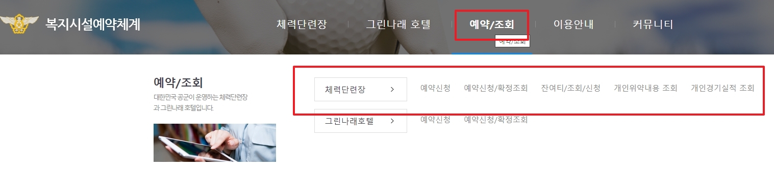 5. 예약/조회 메뉴에서는 체력단련장과 그린나래 호텔의 예약을 진행할 수 있습니다. 예약 신청과 확인, 잔여 티 확인 및 신청, 개인위약 내역 조회, 개인 경기 실적 조회 등 다양한 기능을 통해 사용자들이 편리하게 예약과 관련된 정보를 관리할 수 있습니다. 예약을 통해 원하는 날짜와 시간을 선택하고, 추가 정보를 조회할 수 있습니다.