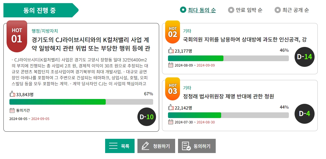 8. 최다 동의 순으로 정렬된 청원 목록에서는 현재 가장 많은 동의를 받은 청원들이 보여집니다. 이 목록은 실시간으로 업데이트되며, 국민들의 관심이 집중된 사안을 쉽게 확인할 수 있습니다. 사용자는 이 목록을 통해 현재 이슈가 되는 청원을 한눈에 볼 수 있으며, 동참하고 싶은 청원에 참여할 수 있습니다.