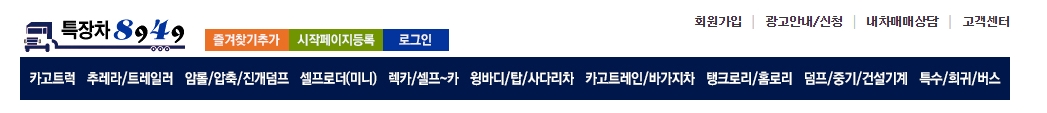 2. 홈페이지 상단에는 다양한 메뉴가 배치되어 있어요. 이곳에서는 카고트럭, 추레라, 트레일러, 덤프/암롤/진개덤프, 셀프로더(미니), 렉카/셀프카, 윙바디/탑/사다리차, 카고크레인/바가지차, 탱크로리/홀로리, 덤프/중기/건설기계, 특수/휘귀/버스 등의 차량 정보를 쉽게 찾을 수 있습니다.