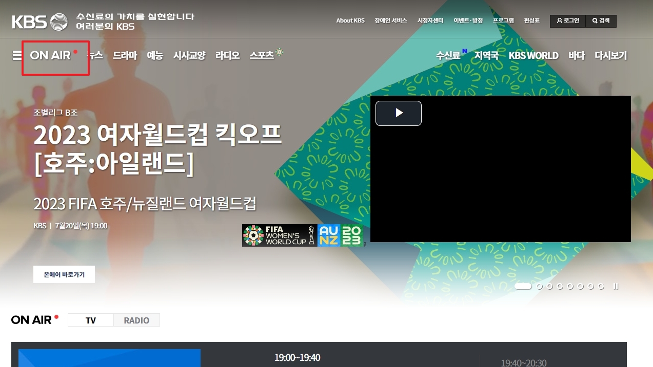 2. 좌측 상단에 On Air 버튼이 보이는데, 이 버튼을 클릭해 봅니다. 이 버튼을 누르면 현재 방송 중인 프로그램을 실시간으로 시청할 수 있습니다. 모바일 환경에서도 쉽게 접근할 수 있도록 배치된 이 기능은, 시청자들이 실시간 방송을 간편하게 이용할 수 있도록 도와줍니다.