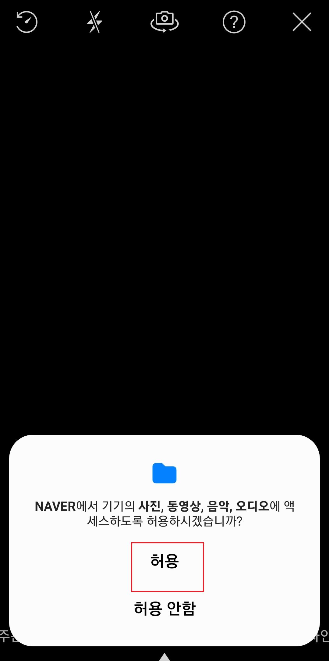 7. 카메라나 사진 권한을 요청받게 되는데, 이때 앱 사용 중에만 허용을 선택하여 권한을 부여합니다. 이 권한을 통해 어플이 카메라와 갤러리에 접근할 수 있게 됩니다.