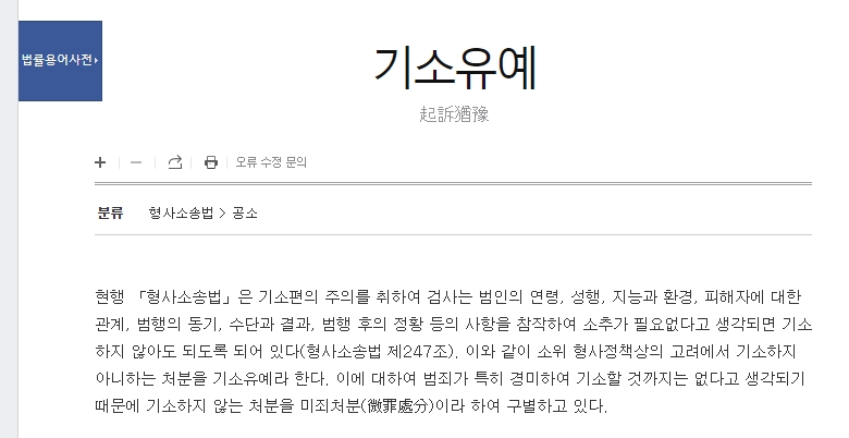 5. 법률용어사전에서는 현행 「형사소송법」에 따라 검사가 범인의 연령, 성향, 환경 등을 참작하여 소추가 필요 없다고 판단될 때 기소를 유예할 수 있다고 설명하고 있습니다. 이런 경우를 기소유예라고 하며, 이는 범죄가 특히 경미할 때 기소하지 않는 미죄처분과는 구별됩니다.