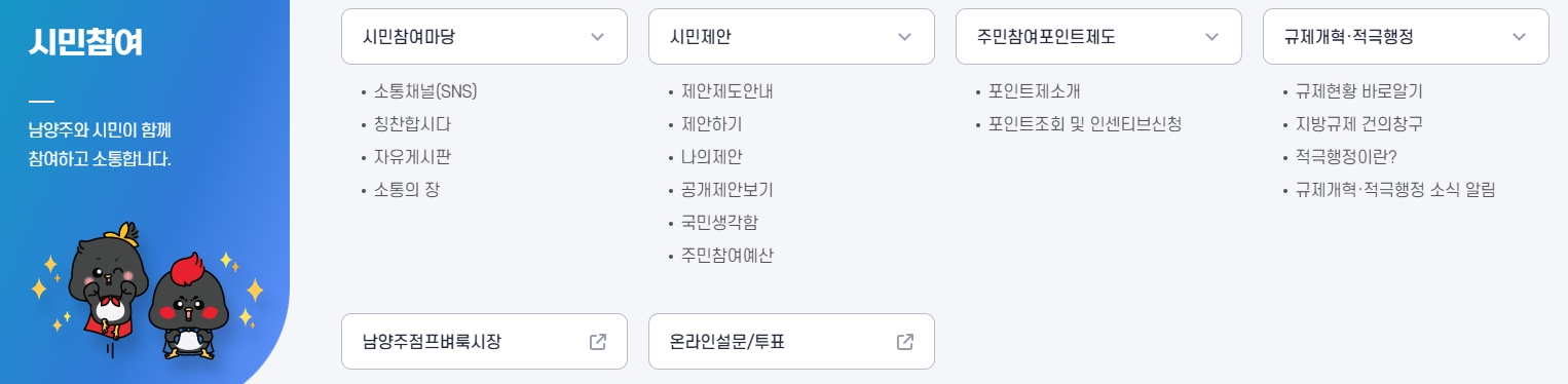 5. 시민참여 메뉴도 상당히 잘 구성되어 있습니다. 이곳에서는 남양주시민들이 시정에 직접 참여할 수 있는 기회를 제공하는데요, 예를 들면 소통채널이나 자유게시판을 통해 시민들이 의견을 나눌 수 있어요. 또한, 제안하기 메뉴를 통해 남양주 시정에 관한 다양한 아이디어를 제출할 수도 있답니다. 이런 시스템 덕분에 시민들이 시정에 더 적극적으로 참여할 수 있겠죠?