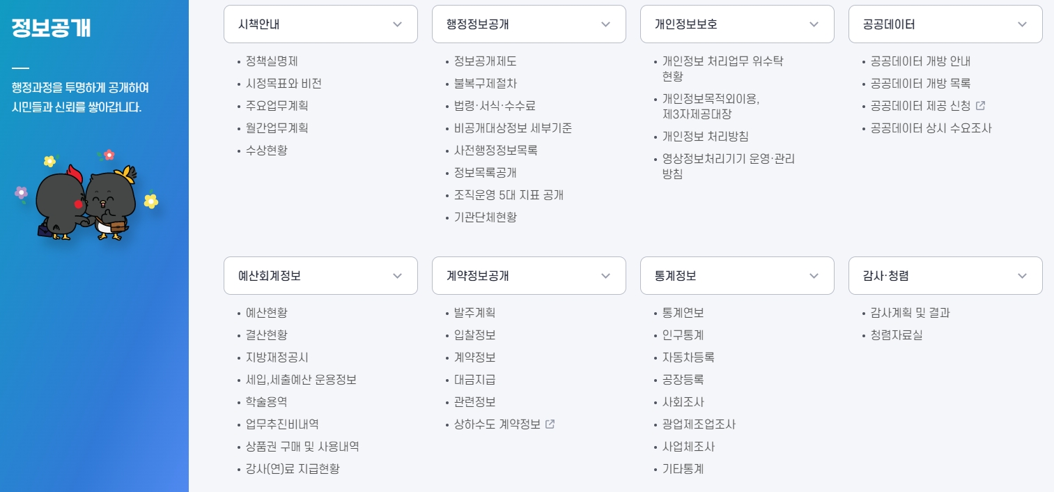 6. 정보공개 메뉴에서는 남양주시의 행정 과정을 투명하게 공개하고 있어요. 정책 안내부터 예산 회계 정보, 행정 정보 공개, 계약 정보 공개까지 다양한 정보를 볼 수 있는데요, 이렇게 공개된 정보를 통해 남양주시의 운영이 어떻게 이루어지고 있는지 시민들이 쉽게 알 수 있습니다. 투명한 행정이 신뢰를 쌓는 데 큰 도움이 되겠죠?