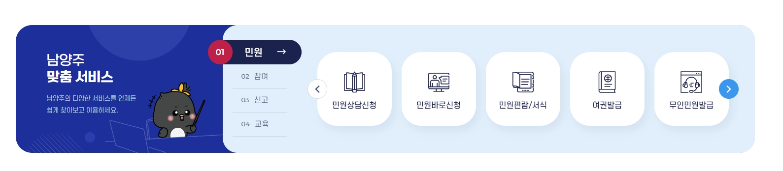 11. 남양주 맞춤 서비스 메뉴에서는 민원 상담 신청, 민원 바로 신청, 민원 편람/서식 등 다양한 맞춤형 서비스를 제공합니다. 필요한 서비스를 바로 이용할 수 있어 시민들에게 매우 편리한 메뉴입니다. 남양주시에서 제공하는 다양한 서비스를 한눈에 확인하고, 쉽게 접근할 수 있다는 점이 큰 장점이죠.