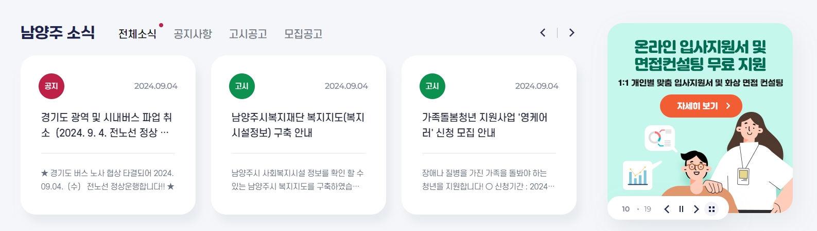 10. 남양주 소식 메뉴를 통해 경기도 광역 및 시내버스 파업 취소 소식이나 남양주시복지재단 복지지도 구축 안내와 같은 중요한 공지를 확인할 수 있습니다. 이런 소식들을 통해 남양주에서 일어나는 중요한 이슈를 놓치지 않고 확인할 수 있습니다.