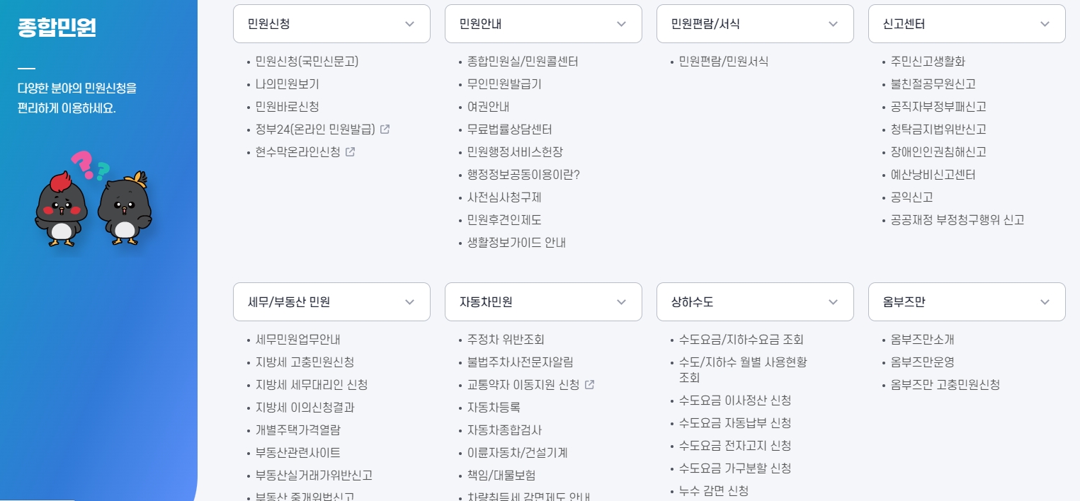 4. 종합민원 페이지로 가보셨나요? 여기서는 민원 신청부터 민원 안내, 각종 신고까지 다양한 민원 서비스를 손쉽게 이용할 수 있습니다. 특히 세무나 부동산 관련 민원, 자동차 민원까지도 여기서 모두 해결할 수 있어요. 모든 민원을 한 곳에서 처리할 수 있으니 아주 효율적이죠.