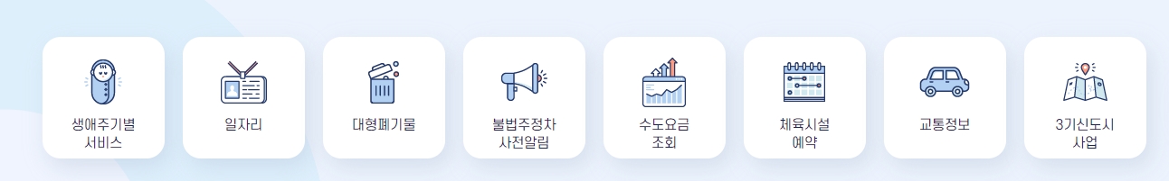 3. 다음으로 눈에 들어오는 건 바로 이 메뉴들이죠. 생애주기별 서비스, 일자리, 대형폐기물 신고, 불법 주정차 사전 알림 서비스, 수도요금 조회, 체육시설 예약, 교통 정보, 그리고 3기 신도시 사업까지 다양한 서비스가 한자리에 모여 있어요. 꼭 필요한 정보를 바로바로 찾아볼 수 있어서 정말 편리하답니다.