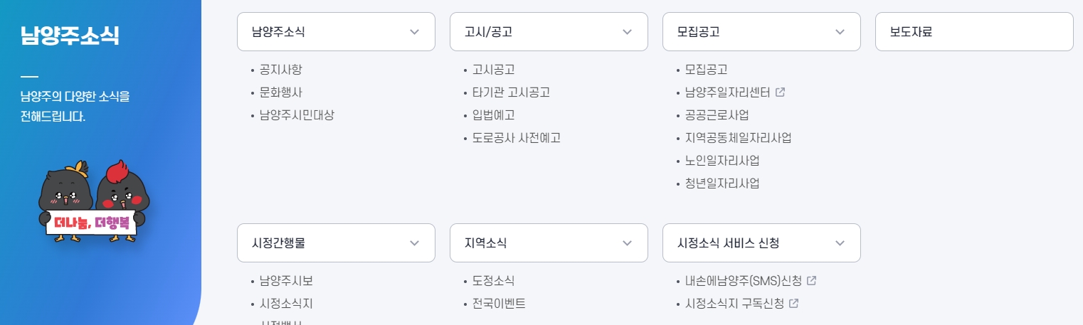 7. 남양주 소식 메뉴에서는 남양주시의 최신 소식을 빠르게 접할 수 있습니다. 공지사항이나 고시/공고, 모집 공고 등 시정과 관련된 정보를 한눈에 확인할 수 있어요. 이렇게 제공되는 정보를 통해 남양주에서 어떤 일들이 일어나고 있는지 쉽게 파악할 수 있습니다.