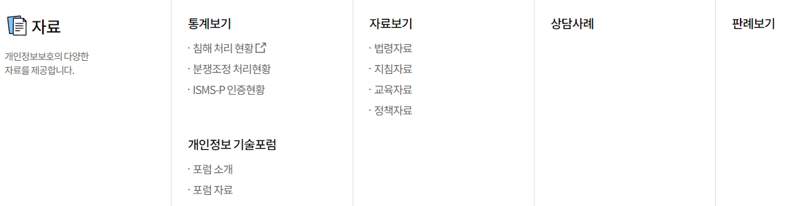 7. 다양한 자료들도 제공됩니다. 법령 자료부터 정책 자료, 교육 자료까지, 개인정보보호와 관련된 다양한 자료들을 이곳에서 확인할 수 있습니다. 필요한 자료가 있을 때 이 메뉴를 통해 빠르게 찾아보시면 좋을 것 같아요.