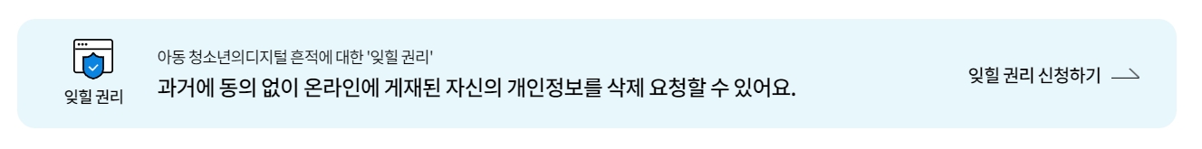 11. 마지막으로, 잊힐 권리와 관련된 정보도 제공됩니다. 특히 아동 청소년의 디지털 흔적에 대한 잊힐 권리를 지원하는 기능이 있는데요, 과거에 동의 없이 온라인에 게시된 개인정보를 삭제 요청할 수 있는 권리입니다. 이 기능을 통해 개인정보를 더욱 안전하게 관리할 수 있겠죠.