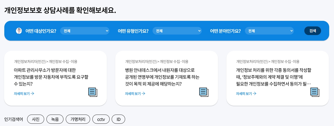 10. 개인정보보호 상담사례를 확인할 수 있는 메뉴도 있습니다. 다양한 유형과 분야별로 사례를 검색할 수 있어서, 비슷한 상황에서 어떻게 대응해야 할지 참고할 수 있어요. 개인정보와 관련된 문제를 미리 예방하는 데 큰 도움이 될 것 같아요.