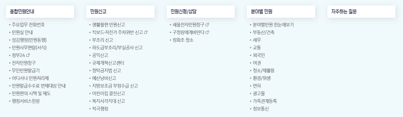 3. 민원 신청과 상담도 이곳에서 할 수 있어요. 세무 관련 전자 민원 창구나 구청장에게 바란다 같은 서비스가 마련되어 있어서 주민들이 불편 사항이나 건의사항을 바로 전달할 수 있어요. 정화조 청소 등 생활에 꼭 필요한 서비스도 홈페이지에서 신청할 수 있더라구요. 직접 방문하지 않고도 온라인을 통해 손쉽게 해결할 수 있는 점이 큰 장점이에요.