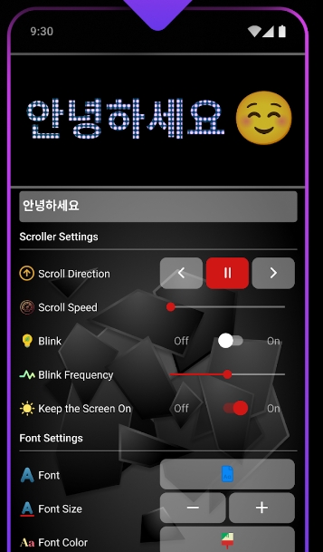 6. 앱을 실행한 후, 원하는 텍스트를 입력하는 화면이 나옵니다. 이곳에서 문구를 입력하고, 그 문구가 어떻게 LED로 표현될지 설정할 수 있어요. 글자 크기, 색상, 폰트 스타일, 그리고 깜빡임 효과까지 원하는 대로 꾸밀 수 있죠. 이 기능을 통해 나만의 멋진 LED 전광판을 만들 수 있어요!